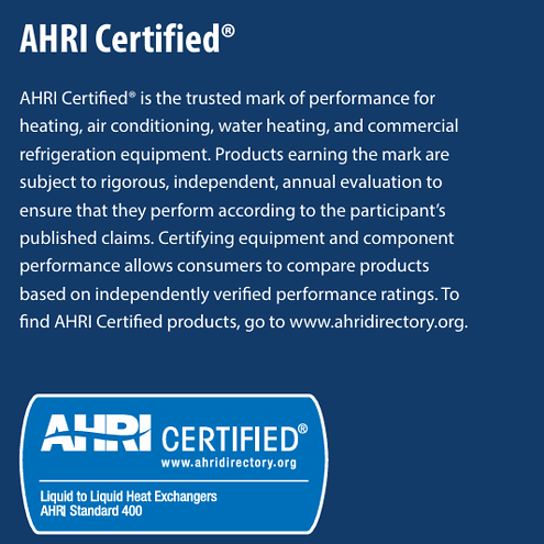 AHRI, or the Air Conditioning, Heating, and Refrigeration Institute is the trade association representing manufacturers of HVACR and water heating equipment. And it is the only globally recognized third-party performance certification for plate heat exchangers.